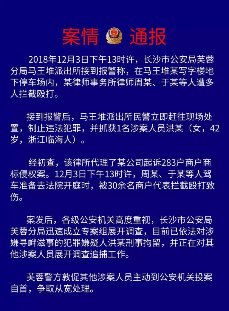 2018年12月3日下午13時(shí)許,長(zhǎng)沙市公安局芙蓉分局馬王堆派出所接到報(bào)警稱,在馬王堆某寫(xiě)字樓地下停車(chē)場(chǎng)內(nèi),某律師事務(wù)所律師周某、于某等人遭多人攔截毆打。