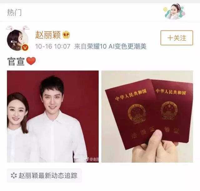 公元2018年10月16日上午10點(diǎn)07分,一個(gè)平靜且普通的周二,昏昏欲睡的世界被趙麗穎和馮紹峰一則突如其來(lái)的婚訊炸開(kāi)了鍋。曾經(jīng)歷過(guò)眾多頂級(jí)流量明星公布戀情,宣布結(jié)婚,承認(rèn)離婚的微博再次服務(wù)器崩潰,長(zhǎng)達(dá)數(shù)小時(shí)無(wú)法刷出任何東西。