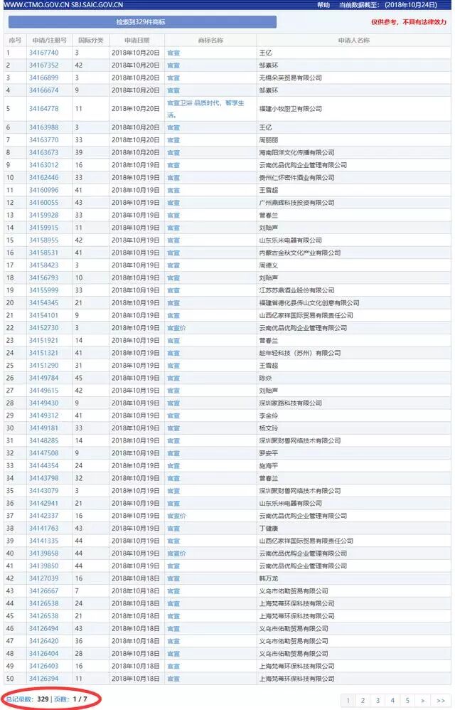 看到了嗎,從2018年10月16日開(kāi)始,截止2018年10月20日,商標(biāo)局網(wǎng)站顯示,提交申請(qǐng)注冊(cè)的“官宣”商標(biāo)已經(jīng)達(dá)到三百多件。怪不得中國(guó)商標(biāo)注冊(cè)年申請(qǐng)量可以達(dá)到五六百萬(wàn)件。